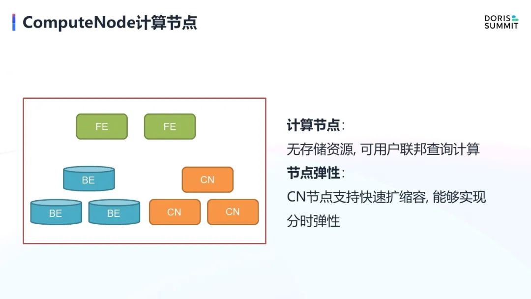 第二点,弹性能力, Doris 本身不具备弹性的,而是有状态服务。但由于我们做了 ComputerNode 能力,也就使 Doris 支持了弹性能力。