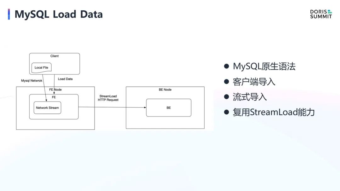 基于这种背景,我们希望能支持 SQL 语法导入客户端本地文件的能力。在具体实现中,我们按照 MySQL 网络协议,通过客户端包发送方式,把在本地的数据通过 MySQL 客户端直接发送到 FE 节点,再通过流式的方式封装成 Stream Load HTTP Request 发给 BE,然后 BE 调用原来 Stream Load 的逻辑把数据导入进去。这个功能实现 MySQL 生态的 Load Data 能力,也是 Doris 支持 MySQL 生态比较大的一个点。