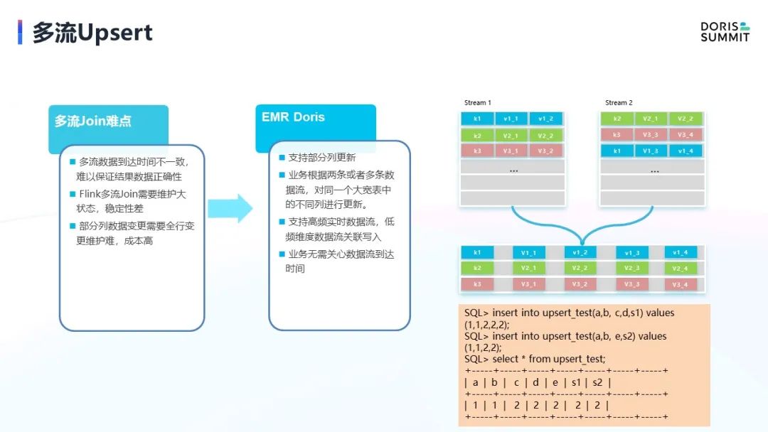 我们有位客户,他有 8 表做 join 的一个案例,因为他之前是用 flink 写到 PostgreSQL中的,PostgreSQL天然支持这种多流 Upsert,所以如果在 Flink 里面改写为 join 方式会非常困难。而 Doris 支持多流 Upsert 后,用法就跟 PostgreSQL 的用法完全一致,效果也会好很多。