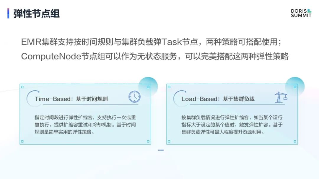 另外一个是基于集群负载的弹性能力实现自动的扩缩容。我们也支持基于时间和基于集群负载的弹性策略混合使用。