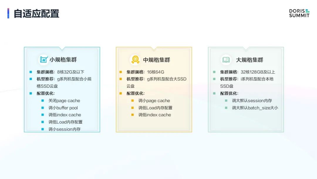 第三点,自适应配置。Doris 目前的默认配置都是基于 IDC 的模式,一般都是按照大规格机器(128G 以上)去推荐设置的。这对于一些云上比较小的客户,比如 30G 以下的小规格的集群,会带来很多问题,我们之前遇到了很多 OOM 问题。