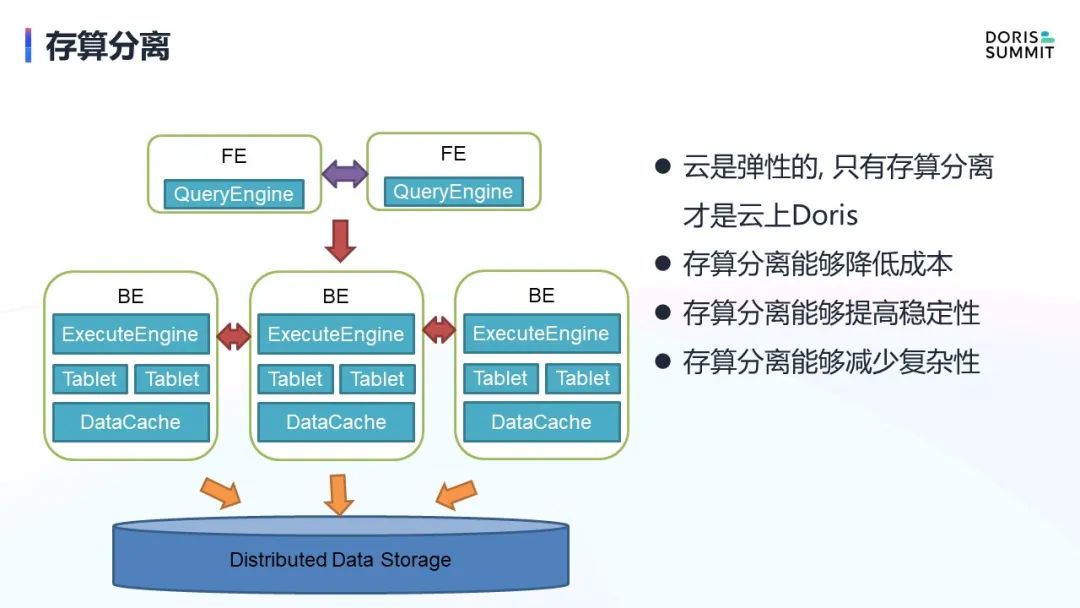 首先是在数据存储方面,因为 Doris 数据是自身进行管理,通过 Tablet 副本实现数据的高可用性。但在云时代,Doris 仍旧自己管理数据其实没什么太大的必要,因为云上有 S3、 TOS 这些对象存储产品,它们能保证非常高的可用性,能达到了十几个 9 级别,这是通过 Tablet 副本很难实现的,这也是我们做存算分离的一个初衷。