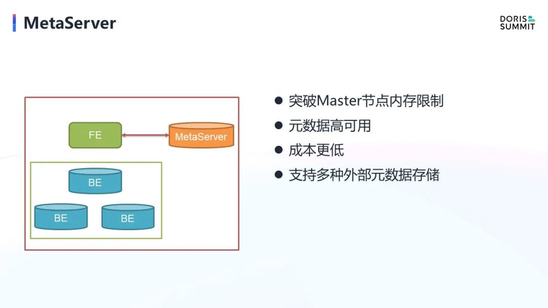 第三,节约成本。现在 FE 要通过三节点实现高可用,如果有了 MetaServer,只要一节点就可以,成本也就随之降低。