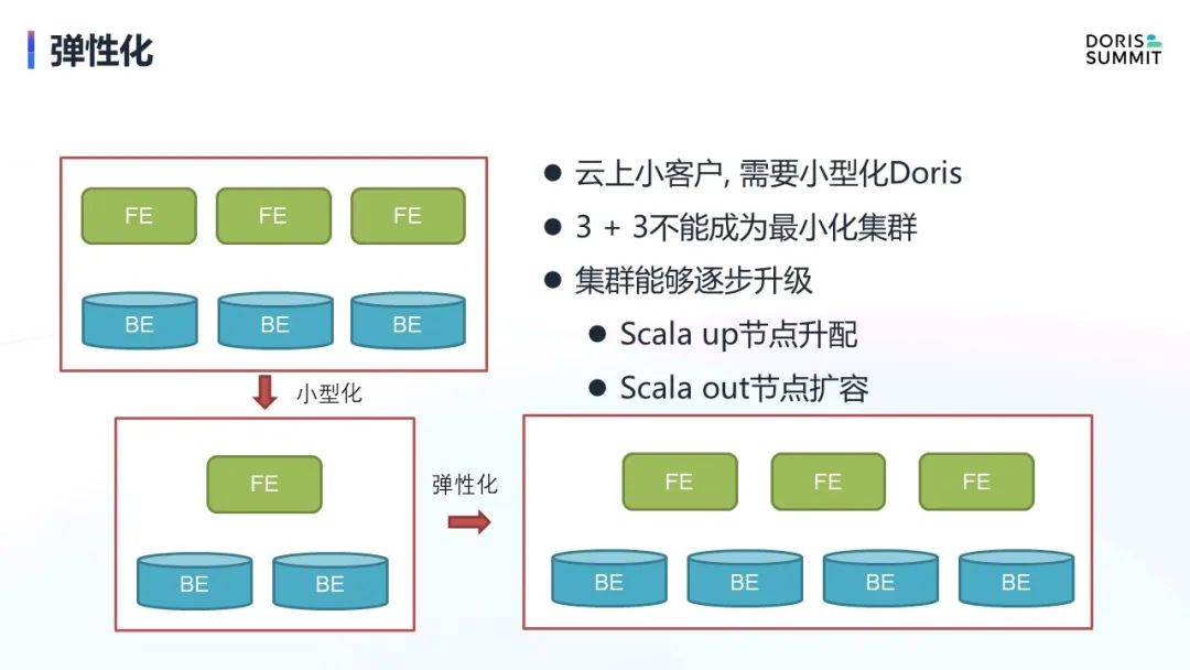 这时候我们可以通过前面两个手段解决了高可用的问题,更好地实现节点的小型化。有了小型化以后,就可以做到一个 FE,两个 BE 来部署一个集群,甚至是一个 FE 和一个 BE 部署一个集群。这样我们可以满足大中小客户的各类需求。