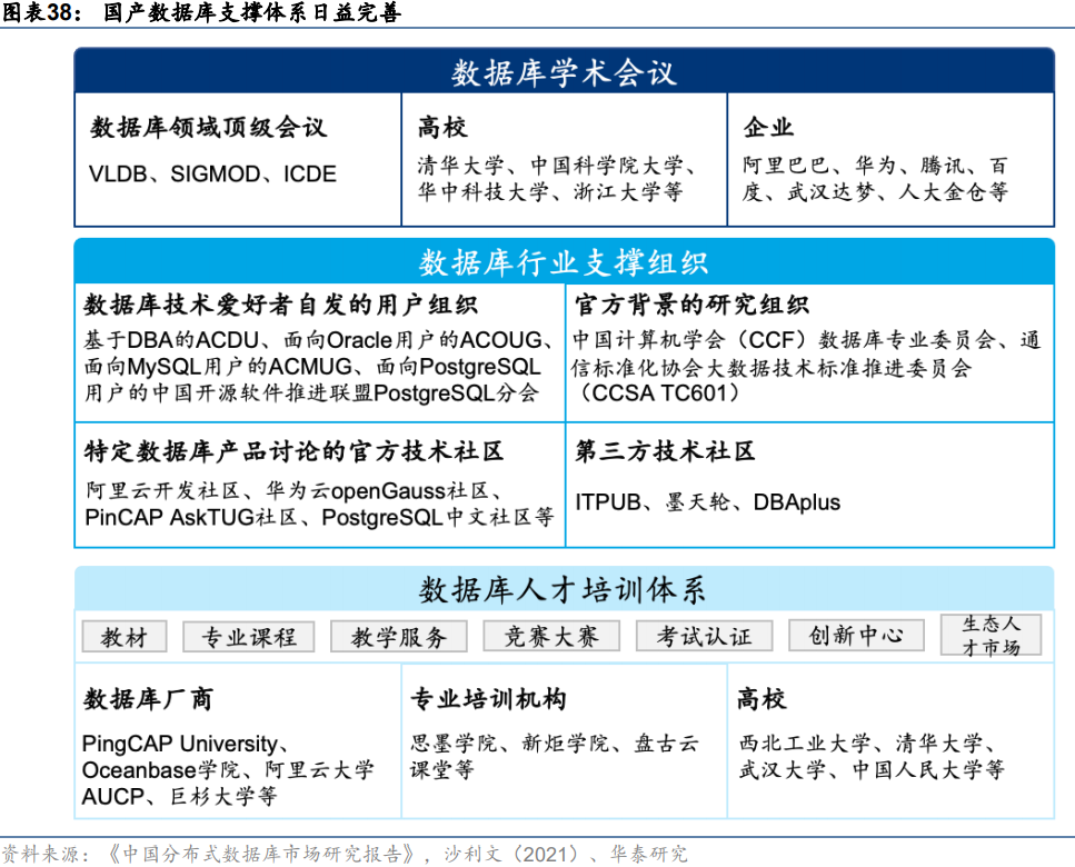 国产数据库的支撑体系不断完善。数据库支撑体系包括学术组织、行业支撑组织、人才培训体系三大类。