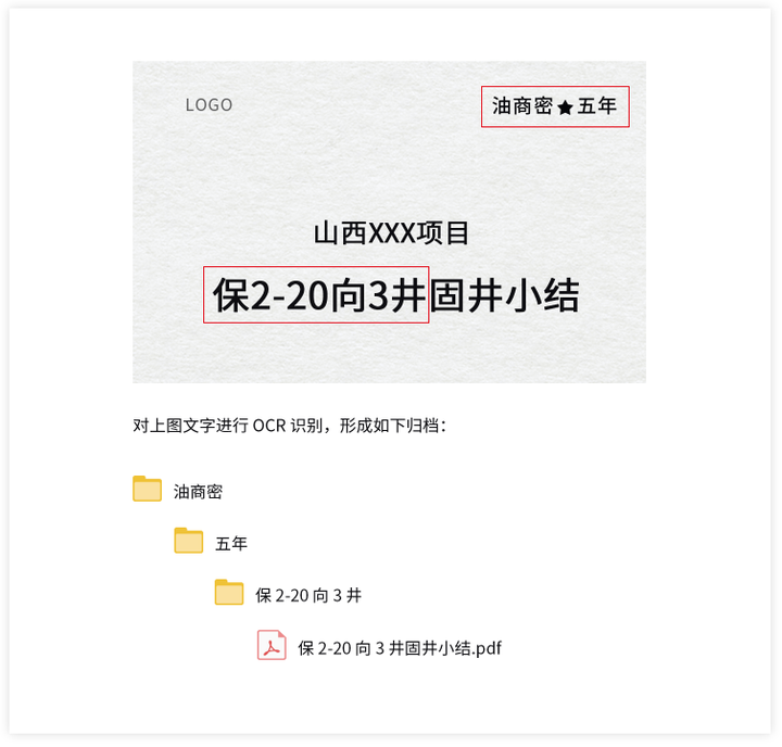 云盒子企业网盘这个自动化过程具体如何实现?下面举个场景。例如某公司的归档材料有固定格式和要求的,文件头部固定含有密级、保存时间、项目等关键词,所以这个自动化的过程是:经OCR识别、提取关键词、云盒子自动创建关键词目录、最后归档。