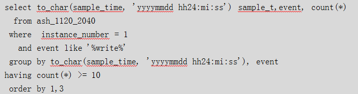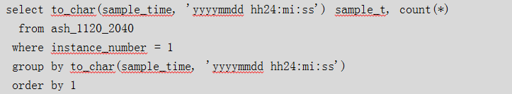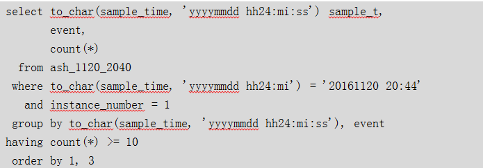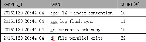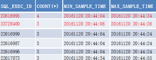 因为ASH功能是按照10秒间隔进行采样,因此,可能在4、14、24、34秒总计采集到4次,也可能在5、15、25秒采集到3次(34秒的时候运行结束,因此下一次35秒的采集将没有该会话)。
