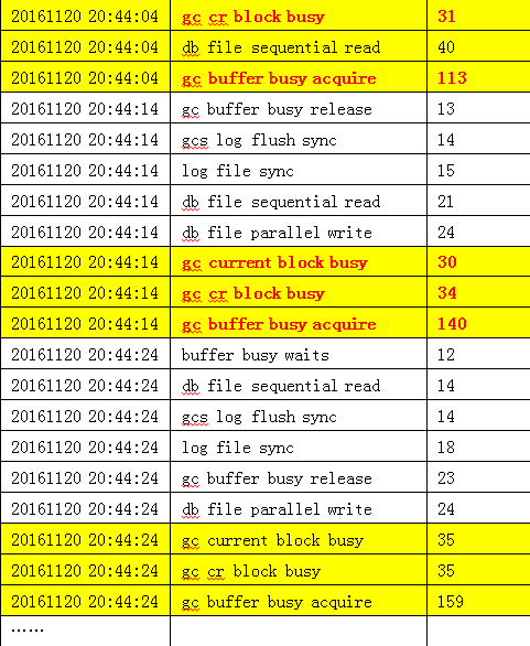 排在第一位的是gc buffer busy acquire,表示数据库集群中的某个节点,如节点1向节点2请求一个BLOCK的时候,节点1已经先有人在我前面申请了同样一个BLOCK,所以连申请都是繁忙的,busy acquire。