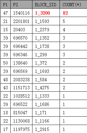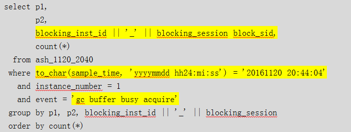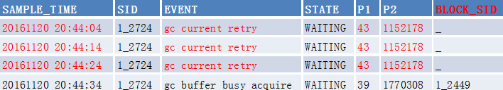 接下来,我们发出下列查询,找到某一瞬间,正在等gc buffer busy acquire的上百个会话,分别在申请哪些BLOCK(p1/p2),被谁阻塞了(blocking_session)。