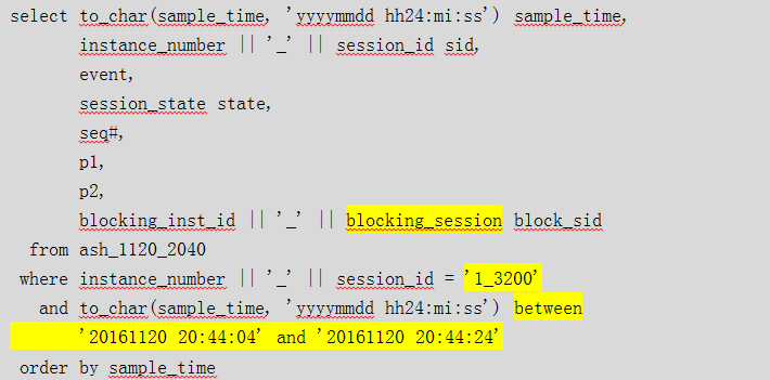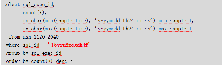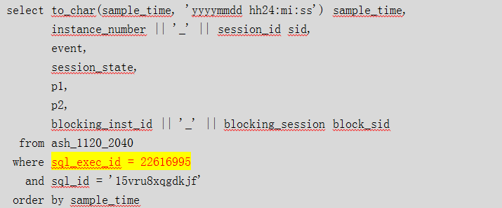 SQL_ID为'15vru8xqgdkjf'在ASH中被连续采样到了4次,说明执行时间大于30秒.与客户描述完全一致。然后呢?如果是你,怎么接着往下查,不妨思考几十秒…