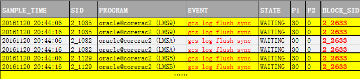 可以看到,这些LMS进程在等gcs log flush sync,即LMS进程在把一个BLOCK传给其他节点前,需要把这个BLOCK在log buffer中的改变,刷到磁盘中的在线日志文件,但是很可惜,刷了很长时间都没有完成。所以没有办法快速将BLOCK传输给节点1,因此节点1在不断retry.这里” gcs log flush sync”的阻塞者2_2633显然就是我们所熟悉的LGWR进程,即log buffer 的写进程。