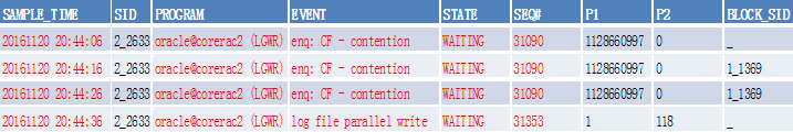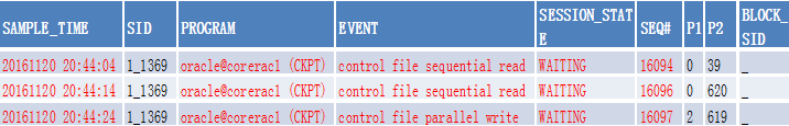 期间等待事件是控制文件的顺序度和并行写,并且没有阻塞,而是一直在变化。正常来说,如果IO比较快的话,那么持有控制文件的锁的时间是非常快的。