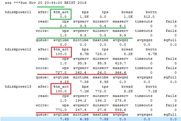 从oswatcher数据可以看到,在问题时段,很多磁盘busy 100%,平均响应时间200多毫秒,IO基本上主要是写,但不是所有盘都100%,例如hdiskpower 11依然是有少量读写的。