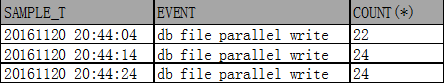 可以看到是问题时刻,在等db file parallel write的进程有24个,显然是DBWR进程在等该数据库总计24个DBWR进程,全部处于活动状态,说明有什么动作触发了大量刷脏块的操作。