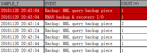 可以看到, RMAN就是在最初的04秒发起,之后的43分34秒往后RMAN进程都还在,但交易已经恢复正常,也就是说RMAN脚本里触发的全量检查点和批量并行写操作产生大量脏块叠加在一起,是问题的原因!