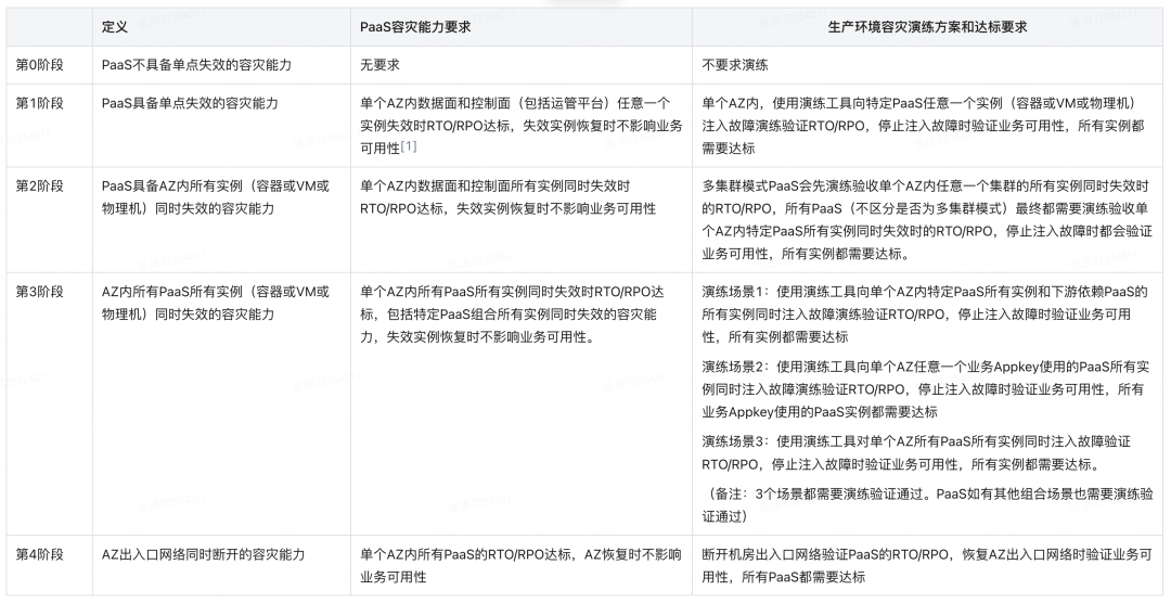 从图4可以看到,我们将AZ容灾分设第0至第4共5个阶段,简称L0-L4。随着等级的提高,场景越来越复杂,相应的规模也越大。从容灾规模维度看,单点->单个集群->某个业务依赖的集群->AZ内的集群,不同规模要求的能力是完全不一样的,除了规模之外还有容灾的场景也会在变化。