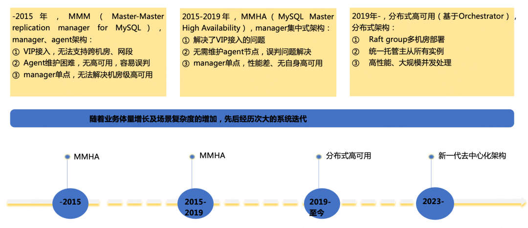 第一代架构是2015年之前,称为MMM(Multi-Master Replication Manager for MySQL),该架构包括接入层VIP、Agent和Manager,这架构本身存在很多问题,比如VIP接入无法支持跨机房、跨网段;Agent和实例绑死,本身也没有高可用,维护起来比较困难;Manager还是单点。 第二代架构是2015-2019年,称为MMHA(Meituan Master High Availability),是在MHA的基础上结合美团数据库生态定制的架构,解决了第一代架构中VIP接入和Agent误判的一些问题,但在2019年以后,由于实例规模变得很大且增长迅速,该架构管理起来异常复杂,Manager是单点没有解决自身的高可用。同时,2019年整个PAAS在演练机房故障,所以当时这个架构逐渐暴露出各种稳定性问题。 第三代架构是2019年,新开了基于Orchestrator定制的高可用系统,实际开始时间是2018年,2019年开始灰度。当时MGR在业界已经有些公司在使用,MGR通过分布式协议来解决高可用难题,我们对此进行了深入的思考:我们是否能引入一个类似分布式协议解决高可用系统面临的问题,本质上就是把MGR中内置的分布式协议放到高可用系统实现。