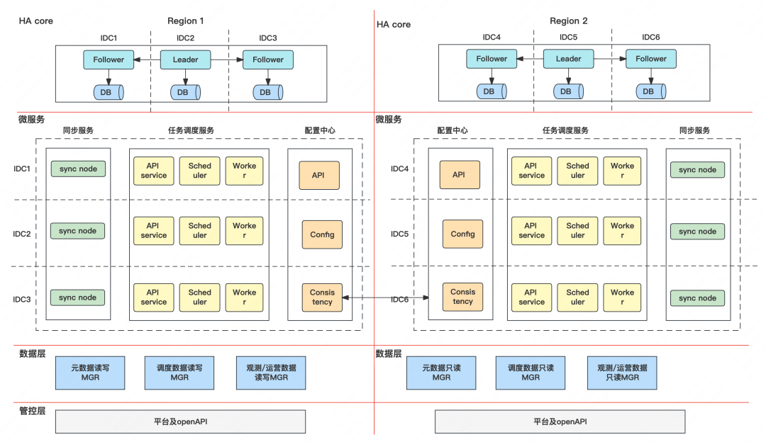同步服务:简单来说,我们的工程师在RDS申请集群或DB之后的信息会全部同步注册到HA Core服务里面去,相当于HA Core是一个“八爪鱼”,它能发现这些信息。 任务调度:它也包括API Service、Scheduler和Worker,主要做状态机任务执行。这两个服务都是多Region、多机房部署,它们本身没有状态。 配置中心:业务应用访问中间件和高可用之间的数据同步纽带,是MySQL的节点发现和处理的核心组件,是双Region部署,有自己的组件,比如有API、Config和Consistency。