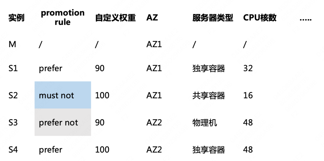 如图11(主库M,从库S1、S2、S3、S4四个实例),S2的选举规则(promotion rule)是一票否决的Must Not,那它一定不能做主库,即使选不出来其他,它也做不了主库。 S1和老主库是同AZ的即都是AZ1,S1比AZ2的S3和S4有更高优先级,即更大的机会作为新主。 S4权重100,S3权重90,S4比S3权重更高,即使S4是独享容器,它也有更高的选举权。