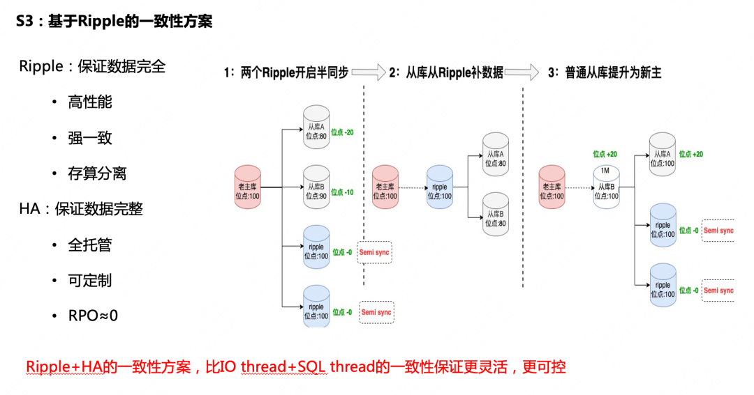 第二个难点是事中从Ripple补数据,Ripple毕竟不是普通的MySQL,所以需要HA去兼容,但HA处理数据比SQL线程灵活很多,因为SQL线程在需要实时处理数据来保证一致性,而HA只有在故障期间才处理数据,可以拉长RTO做很多定制。还有这里提到的RPO≈0,为什么是近似,因为虽然可以做到RPO=0,但要接受RTO的损耗。如果你既要RTO,又要RPO,那么可以在策略灵活配置。