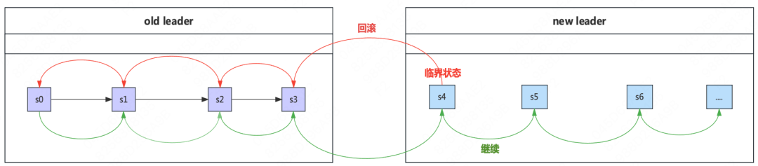 状态同步:Leader实时将状态机通过Raft同步到所有的Follower节点 临界状态:根据执行代价确定的状态机临界点 回滚:新Leader执行状态机回滚,包括对应的操作 继续:新Leader继续执行老Leader的状态机