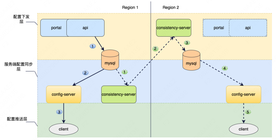 由于配置服务是双Region部署,分为同Region下发和跨Region下发。同Region下发会写到存储层,而config-server会更新最新配置,将配置并推送到客户端。跨Region下发,比如说北京、上海和深圳都有业务服务节点,最终把它推送下去的时候也会走一致性服务(Consistency-Server),即一旦某个Region更新后,我们会把数据推送到另一个Region里,Region之间的数据完全一致,如果另外一个的Region有业务服务节点,就会继续走同Region下发流程。