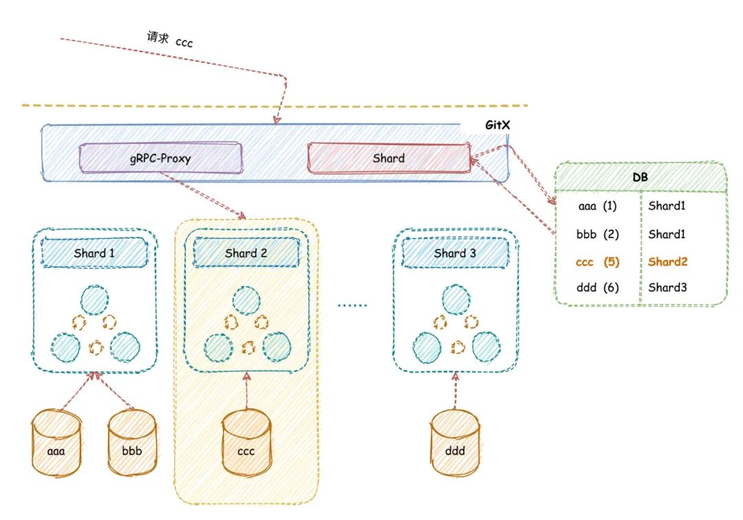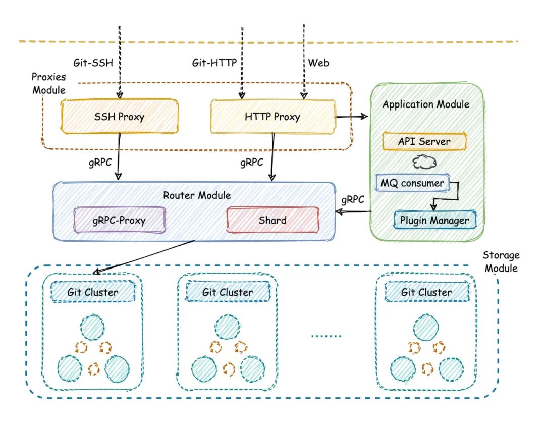 SSH Proxy:提供Git-SSH请求代理,通过路由模块获取路由信息,到目标机器执行SSH操作。SSH Proxy组件基于go-crypto库开发,实现了公钥识别用户,流量控制,长连接超时处理,SSH转gRPC等功能。后续计划引入signature校验,以应对不同的使用场景。 HTTP Proxy:提供Git-HTTP/Web请求代理,通过路由模块存储的仓库分片映射关系,决策仓库路由节点。HTTP Proxy基于Go-Gin开发,实现了请求甄别,流量控制,多层代理等功能。最初HTTP Proxy还被作为灰度迁移的核心组件,通过流量统一收口,支持请求分发到新老Code系统,以确保请求和数据的平滑迁移。