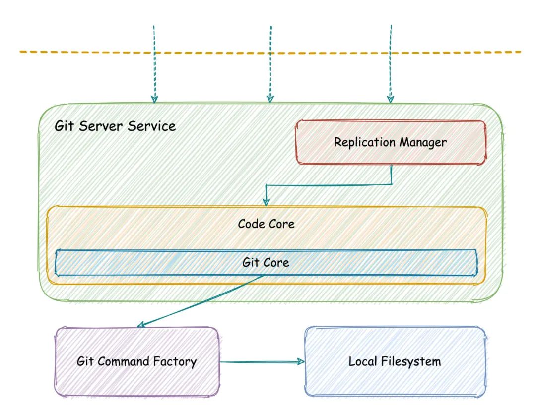 Replication Manager:数据复制核心模块,根据不同的请求(读、写或初始化)执行不同的复制逻辑,从而保障数据一致性。 Code Core:Git Server的核心服务模块,主要提供了Git的gRPC API供上游模块使用。 Git Core:实现扩展性和高可用性的重要组件,这里通过源码的方式将GitLab生态开源组件引入到项目中,作为第三方Git API供项目使用。 Git Command Factory:Git命令的中枢控制器,提供控制Git进程数量、传递参数上下文,隔离执行环境及格式化输出数据等功能。