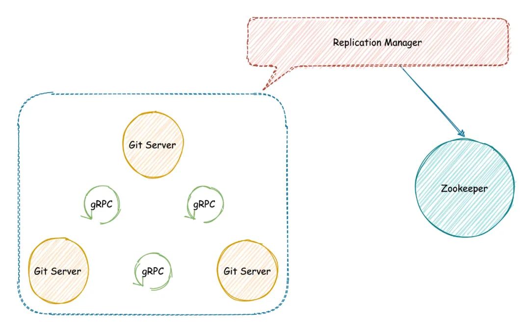 Git Cluster:又称为分片,它由三个Git Server节点组成。三个节点间通过各自的Replication Manager模块获取到集群中其余节点的IP等信息,使用gRPC协议进行数据复制备份,可以保证用户视角的数据一致性,逻辑架构如下图11所示: