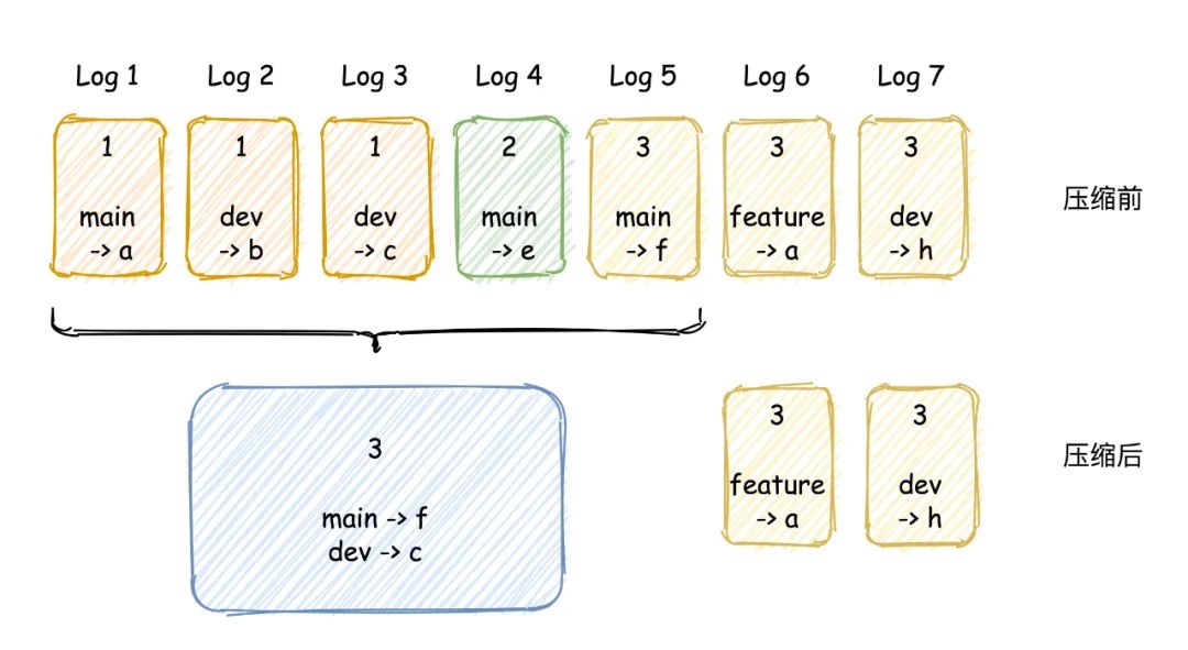 并将其应用于初始状态,与压缩前回放触发的结果是一致的,main都将指向值为f的commit。
