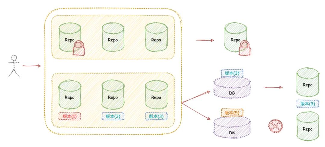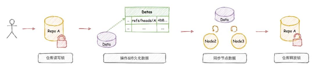 通过引入仓库粒度的写锁,保证同一个仓库同时只能在一个节点执行写入操作,然后通过Git Internal Hook机制触发object数据的同步,并持久化记录refs数据。 副本节点通过读取持久化的refs数据,重演操作,从而保持了refs数据与写入节点一致。