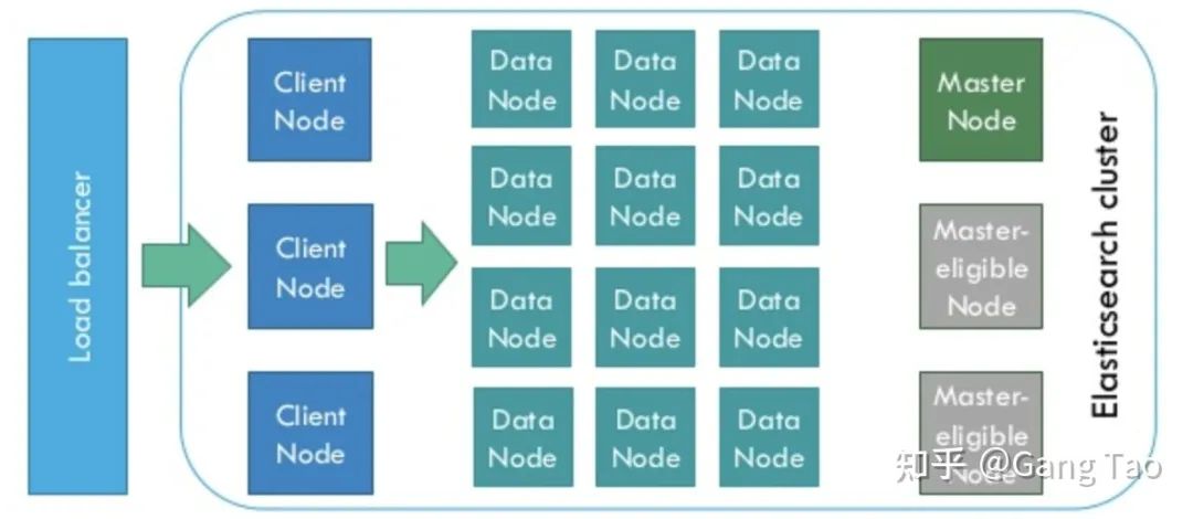 ElasticSearch是为分布式设计的,有很好的扩展性,在一个典型的分布式配置中,每一个节点(node)可以配制成不同的角色,如下图所示:
