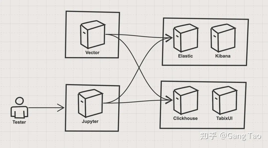 数据导入 stack 数据导入部分使用了Vector.dev开发的vector,该工具和fluentd类似,都可以实现数据管道式的灵活的数据导入。 测试控制 stack 测试控制我使用了Jupyter,使用了ES和Clickhouse的Python SDK来进行查询的测试。