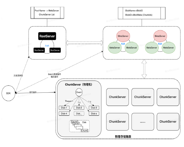 MetaServer:管理着用户数据的元信息,包括Blob、Blob由哪些Chunk构成,Chunk和ChunkServer的映射关系等。MetaServer在集群中可以有多组,使得元信息管理能水平扩展。