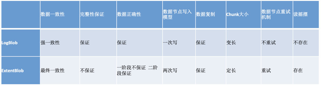 为了满足不用的应用场景,目前我们提供两种类型的Blob,LogBlob用于支持追加写、ExtentBlob用于支持随机写。系统通常是将数据写到LogBlob,然后后台回刷到ExtentBlob。