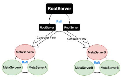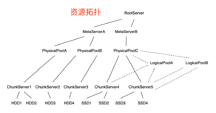 RootServer:集群的入口,管理着整个集群中资源信息,包括MetaServer、ChunkServer、磁盘等信息。