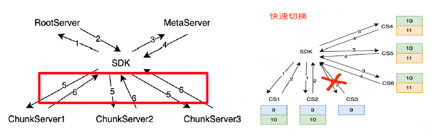 控制流方向,SDK不会频繁和RootServer和MetaServer交互,只有在申请新Chunk是才去交互。
