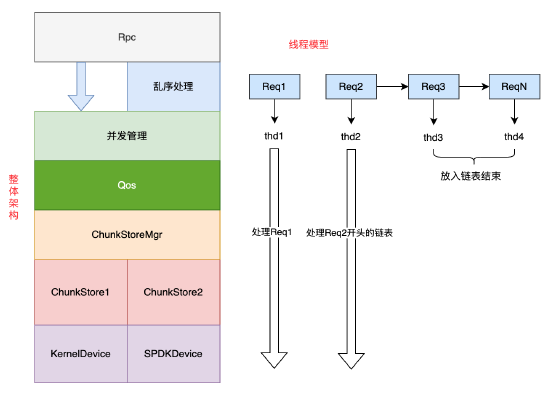 基于以上结论,我们研发了用户态文件系统(裸盘系统),它设计成针对Blob特点的磁盘管理方式,简单、高效。我们在裸盘系统下抽象出BlockDevice层,使其能适配不同的设备,如SPDK、IOuring等。目前我们使用SPDK作为磁盘驱动,实现ChunkServer全栈用户态。