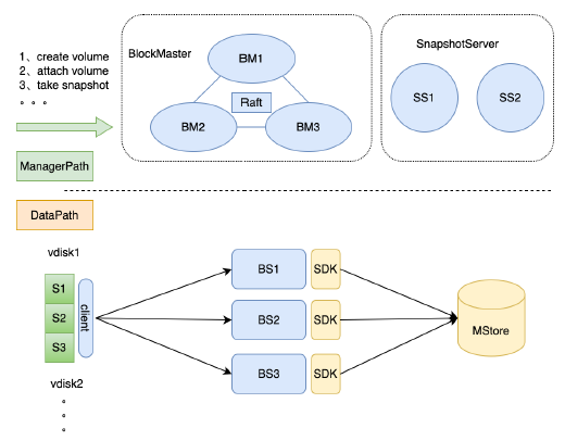 EBS系统(块存储)是应用在MStore的第一个项目。EBS有4个子系统:BlockMaster、BlockServer、Client、SnapshotServer。