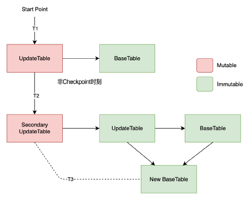 定期做Checkpoint有利于系统重启快速恢复,会生成一个新的SecondaryUpdateTable,旧的UpdateTable变为只读,和原来的BaseTable合并生成一个新的BaseTable。