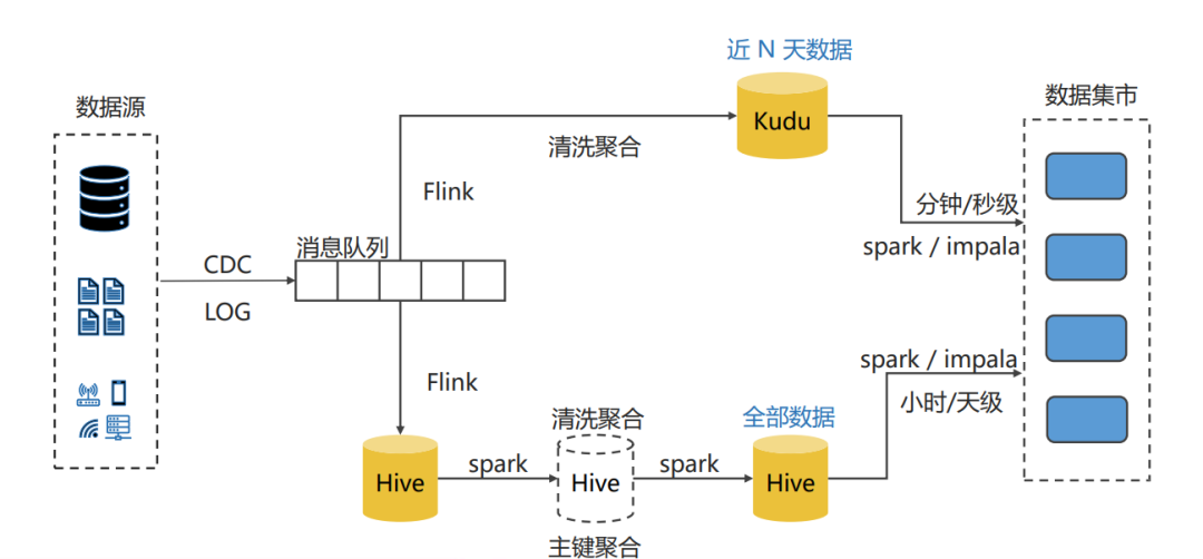 实时链路,当时的做法跟现在很多企业一样,那就是在T+1的链路之上,重新去构造了一个实时链路。实时链路的存储用消息队列,计算引擎是 Flink。但是 ,Flink 在当初开始使用的时候,很难像 Hive一样去做数据分层。所以,大部分人的业务都是根据实际的需求,就去写一个Flink任务,从源头把数据接进来,经过聚合清洗之后,写到像Kudu这样的实时的数仓里面,然后在实时数仓里面去做分析,或者可以直接接到其他支撑实时更新的系统,比如数据库。