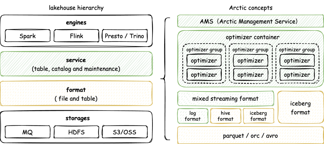 arctic是一个开放式架构下的湖仓管理系统,首先它面向开放式架构,面向不同的 table format。现在,主要面向 Iceberg format,然后企业自己也在Iceberg之上有一套Mixed streaming format的实现。以后也会去尝试去对接更多的 table format,比如说 Hudi 或者Delta,我们认为他们有管理优化等相同的需求,arctic 都是可以作为一套湖仓管理系统去对接这些format。arctic是在开放的表格式之上,首先它与Iceberg 、Hudi不是竞争关系,arctic是这些技术之上的管理服务。Arctic面向场景更多地关注流和实时更新的场景,并且提供一套可插拔的数据自优化的管理服务。