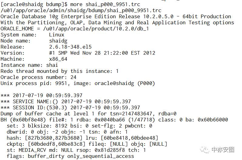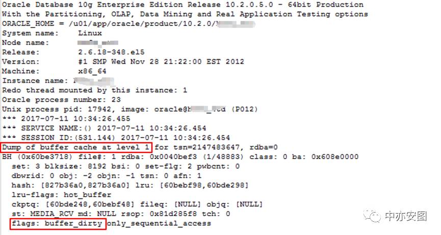 从内容上看,全部都是dump的buffer cache中的数据,所有的数据都是带有buffer_dirty的flag;那么这里是主动dump的dirty buffer呢还是因为所有的buffer 都是dirty的?其实想一想,这是10g的dataguard的备库(只应用redo 日志来修改数据块,不会有其他访问数据的请求),也就不难理解了。