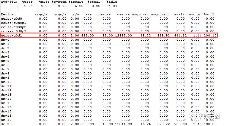这里可以看到cciss/c0d1盘正是数据库数据文件所在磁盘,其磁盘使用率达到了100%,表面看起来很繁忙,但是我们知道这个磁盘除了数据库(数据库软件和数据文件等)在使用外,并没有其他程序再使用;