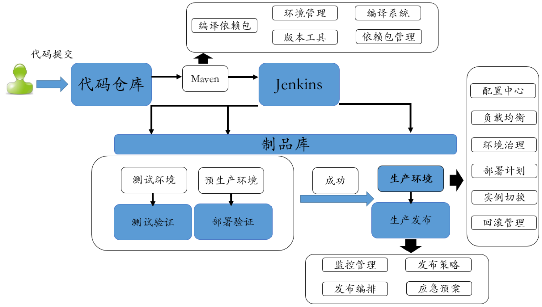 通过下面一幅图可以了解持续交付的运作过程,部署结果由业务连续性进行深度主导、能力子域之间的协作以服务目录的方式进行、持续部署需要控制部署的泛滥、部署过程通过热部署进行、环境管理能够和云计算进行集成。