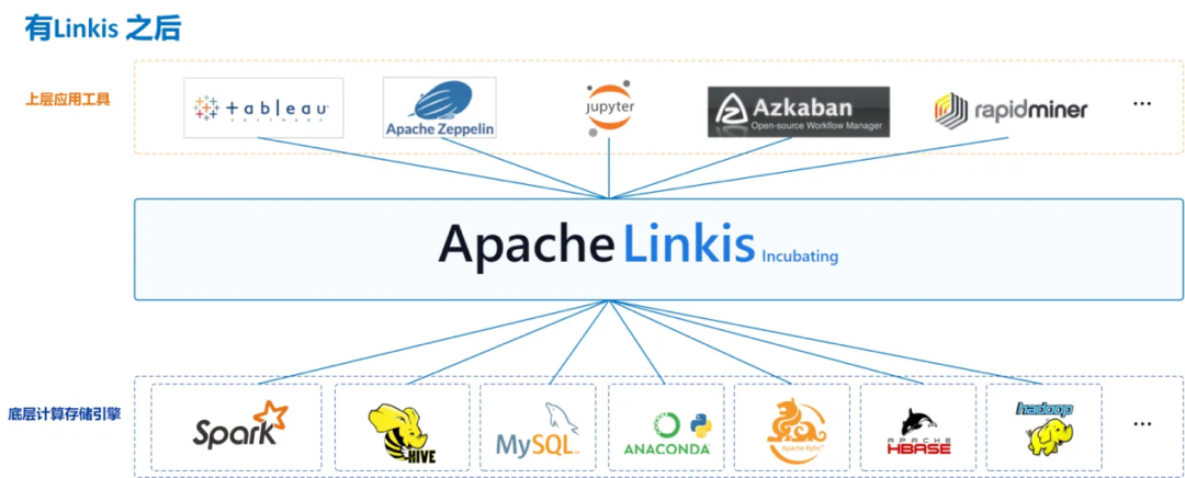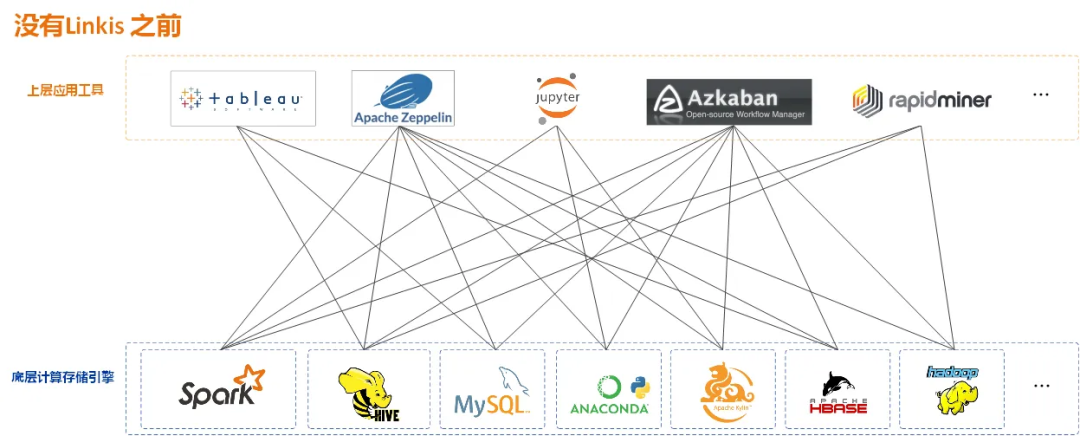 为解决这个痛点,WeDataSphere 团队开发了数据应用开发管理集成框架 DataSphere Studio。DataSphere Studio 将这些数据工具统一了起来,基于 AppConn 插拔式的集成框架设计,在统一的 UI 下,以工作流式的图形化拖拽开发体验,将满足从数据交换、脱敏清洗、分析挖掘、质量检测、可视化展现、定时调度到数据输出应用等,数据应用开发全流程场景需求。AppConn,定义了一套统一的前后台接入协议,总共分为三级规范,可让外部数据应用系统快速简单地接入,成为 DataSphere Studio数据应用开发中的一环,是 DataSphere Studio可以简单快速集成各种上层 Web 系统的核心概念。随着大数据技术的普及和深入发展,越来越多样化的用户场景需求,催生出了非常多上层应用工具和底层计算存储引擎。在当前的大数据平台架构体系下,我们会发现从上层应用工具,到底层的各个引擎,还是各自为政,Server-Client 模式紧耦合满天飞。在大量的上层应用工具和大量的底层引擎之间,缺乏一层通用的“中间件”框架设计,导致整个大数据平台变成下图的复杂网状架构:大量的上层应用和底层引擎之间,缺乏一层通用的“中间件”设计。由于缺乏一层通用的中间件层框架设计,使得连通、扩展、管控、编排、复用等“计算治理” 问题凸显。例如:从“连接”问题来看,大数据底层计算存储引擎繁多,各个上层应用工具需要各自维护底层引擎的 Lib 依赖、运行时环境等信息,导致部署运维工作极其繁重,底层引擎任何变动都会影响上层应用的可用性和可维护性;再从“扩展”问题来看,比如某个上层应用之前使用 Hive,后面觉得 Hive 计算太慢现在想用 Spark,用了 Spark 后还是觉得太慢想用 Presto,Presto 太慢又想用 ClickHouse,这时这个上层应用工具需要分别去扩展对接这些引擎,这无疑会带来非常巨大的开发成本。再来看“复用”问题,每个上层应用都要重复集成和管理各种底层引擎的 client 的连接及其状态,特别是在并发使用用户逐渐变多、并发计算任务量逐渐变大时,每个上层应用还要重复解决多个用户间在 client 端的资源争用、权限隔离,计算任务的超时管理、失败重试等等计算治理问题,造成的开发人力浪费不可小觑。除了上述的架构层面问题,要想让复杂分布式架构环境下,各种类型的计算任务都能更简洁、灵活、有序、可控地提交执行并成功返回结果,计算治理还需关注高并发、高可用、多租户隔离、资源管控、安全增强、计算策略等细化特性问题。这里就不一一展开论述了。Apache Linkis 计算中间件解决数据平台连通、扩展、管控、复用等问题。在这样的背景下,计算中间件 Apache Linkis(incubating)应运而生,它是WeDataSphere团队专门设计用来解决上述紧耦合、重复造轮子、扩展难、应用孤岛等计算治理问题的。当前主要解决的是复杂分布式架构的典型场景-数据平台环境下的计算治理问题。Apache Linkis(incubating) 在上层应用和底层引擎之间构建了一层计算中间件。通过使用 Linkis 提供的 REST/WebSocket/JDBC 等标准接口,上层应用可以方便地连接访问 Spark、Presto、Flink 等底层引擎,同时实现跨引擎上下文共享、统一的计算任务和引擎治理与编排能力。