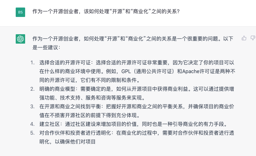PS,作为一个创业者,该如何处理“开源”和“商业化”之间的关系,我们问了ChatGPT,以下是ChatGPT的回答:
