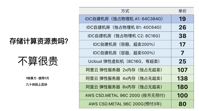 千把块的单价,比起 Oracle 动辄上万的核月 License Fee 好像便宜不少。如果买个几核的小微实例,好像 RDS 还是挺合算的,几倍溢价也不算什么。但只要数据库的规模稍微大一点,这种线性增长的费用模型就是纯粹的杀猪:为了不需要的弹性支付几倍溢价,不是理智的行为。