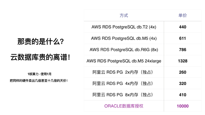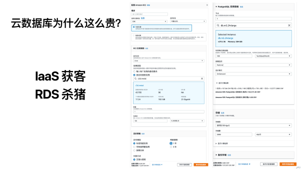 为什么会是这样呢?用话术说差不多是,数据库是基础软件里的皇冠明珠,凝聚着无数无形知识产权BlahBlah,价格远超硬件,那是很自然的事呀。如果是 Oracle 这样的顶尖商业数据库,这也许勉强说得通。但公有云上的云数据库,本质上就是免费开源数据库内核换皮封装魔改,加上自己管控软件和共享DBA人头。一番操作,就敢把核月单价 20 块的机器卖出 1000 元的天价,这就非常离谱了。