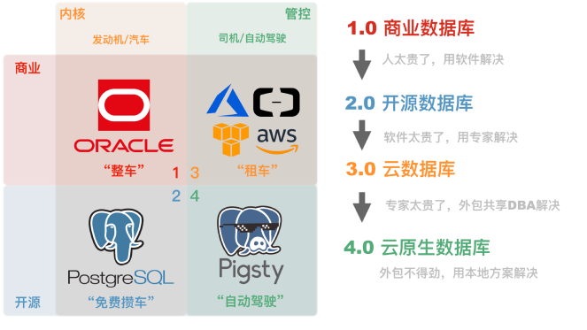 最开始,以 Oracle 为代表的商业数据库,替代了人工纸笔手算,用软件取代了人节省了很多花费。 不过,Oracle 这样的数据库还是很贵,所以像 PostgreSQL这样开源免费的数据库出现了。大多数场景下,如果能雇到一两个专家,用好开源数据库,那可比傻乎乎给 Oracle 送钱要实惠太多了。
